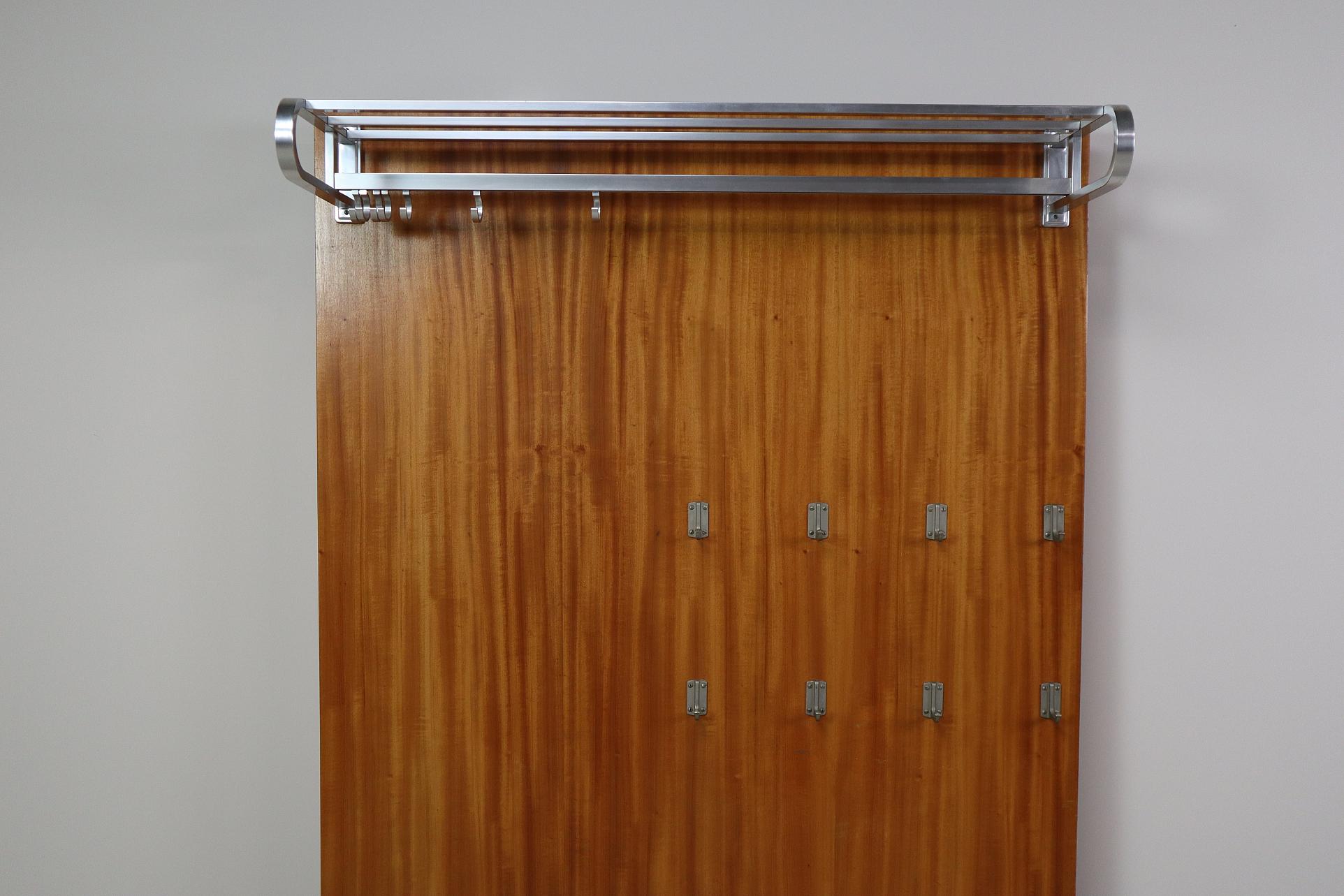 A striking mid-century modernist wall-mounted cloakroom panel in warm Teak veneer, fitted with elegant metal details.