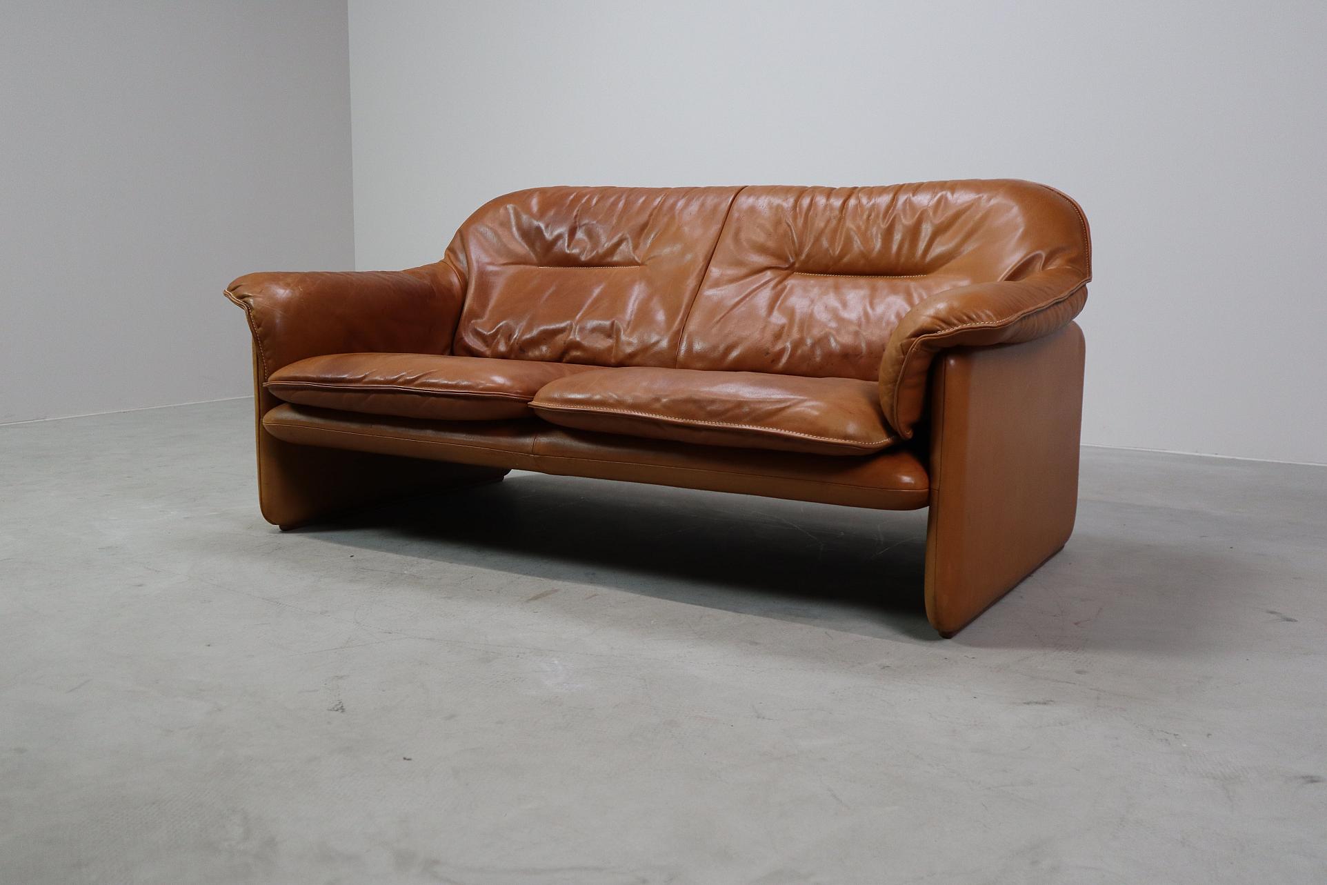 Upholstered in supple cognac leather with an exquisite natural patina, this piece has been gently cleaned and conditioned to preserve its original character. The seat cushions show visible spots and marks from decades of use – a true testament to its vintage authenticity. The frame and structure remain solid and comfortable.