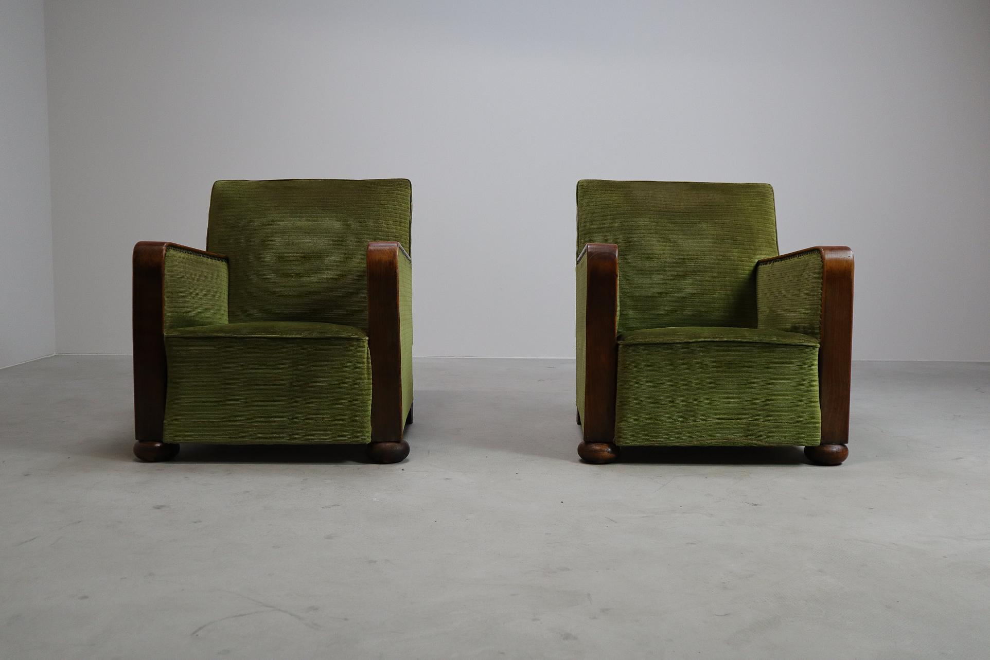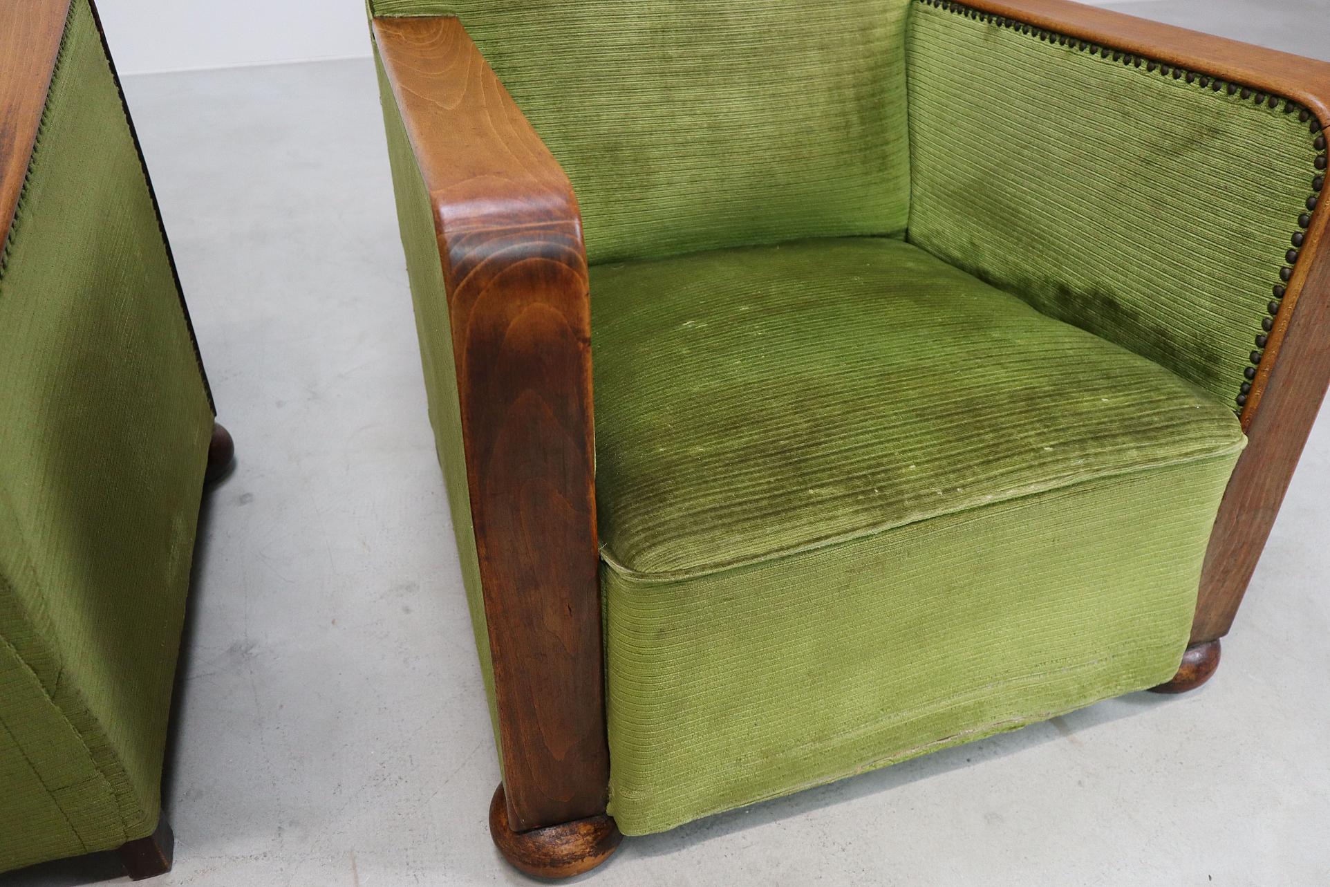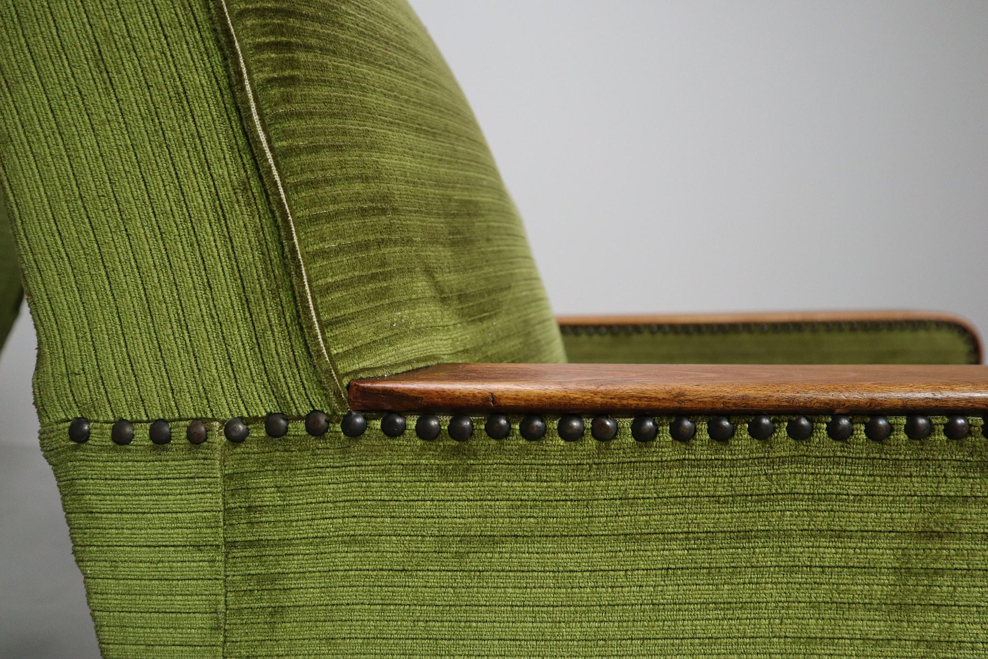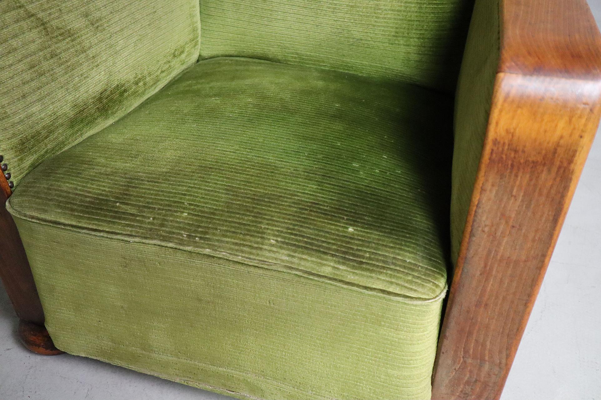 A refined pair of authentic Art Deco club chairs, circa 1930. The chairs feature solid wooden armrests with elegant curves, short rounded feet and decorative studs along the edges. Upholstered in their likely original green ribbed velvet, they have developed a charming patina and light wear consistent with age.