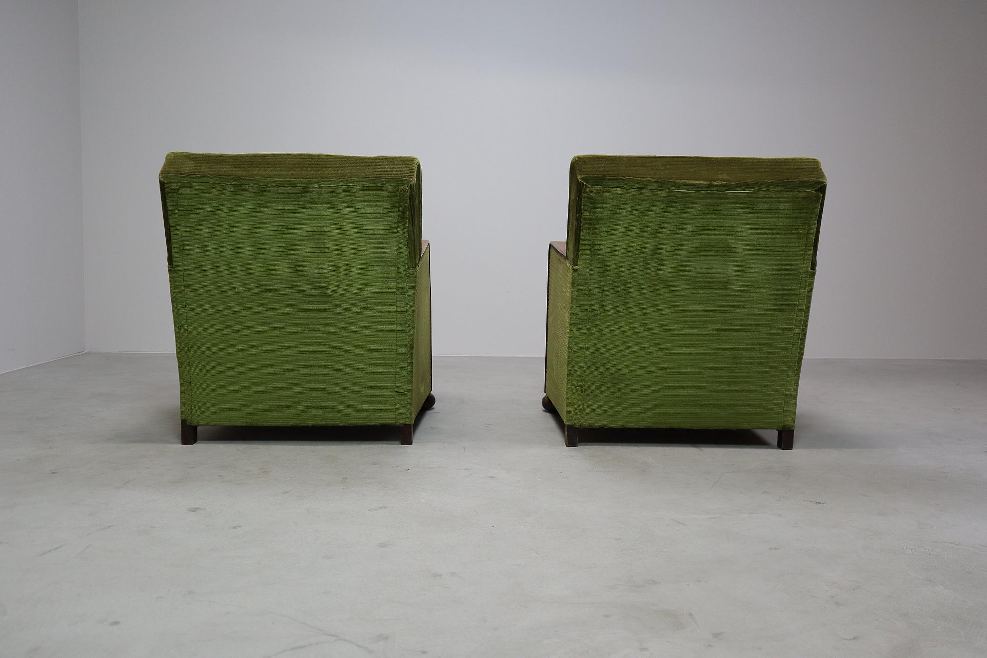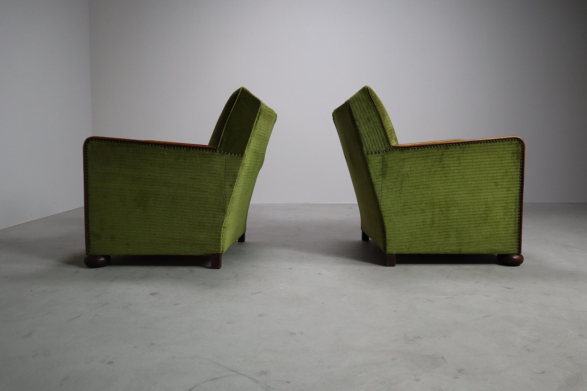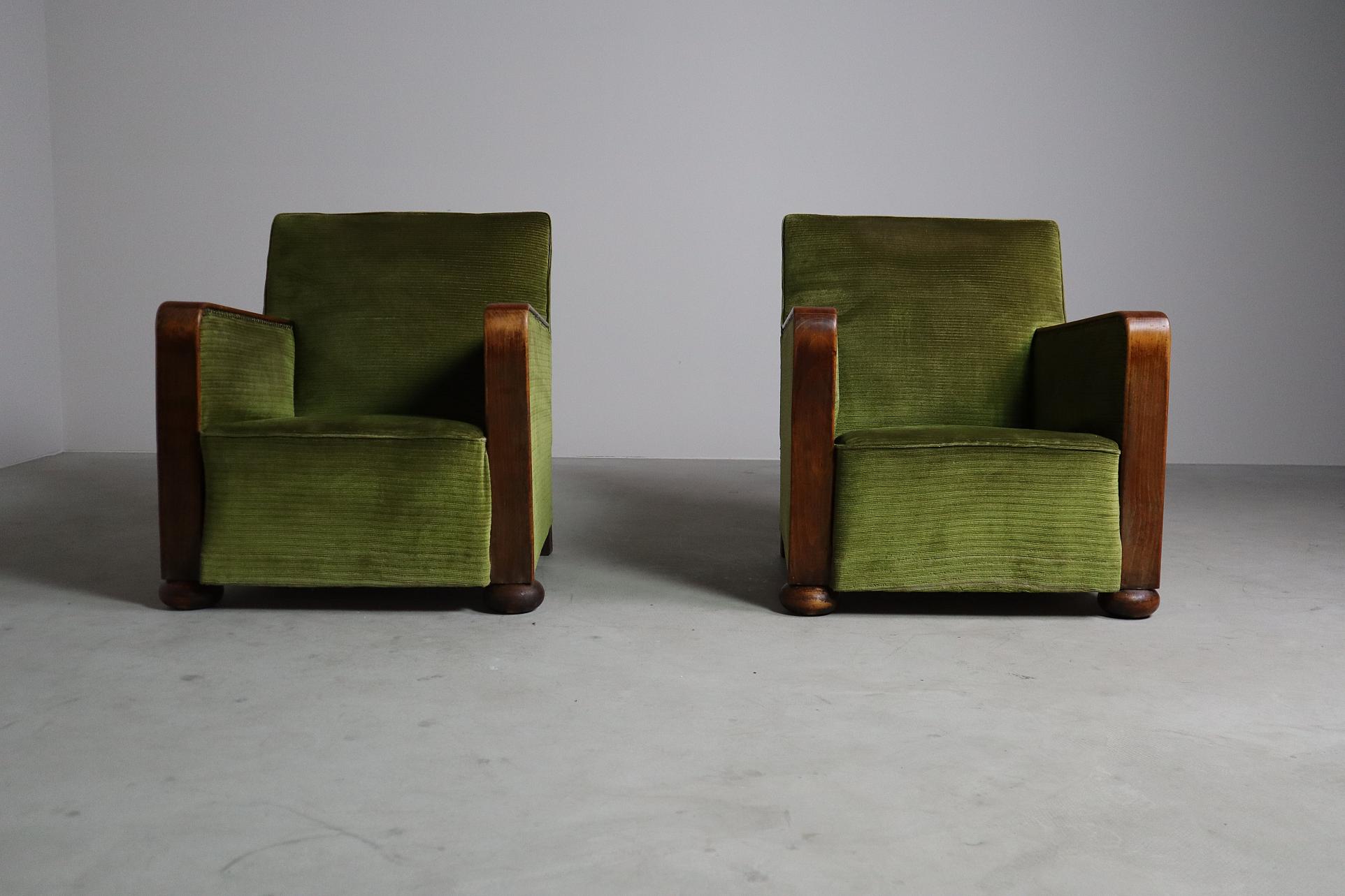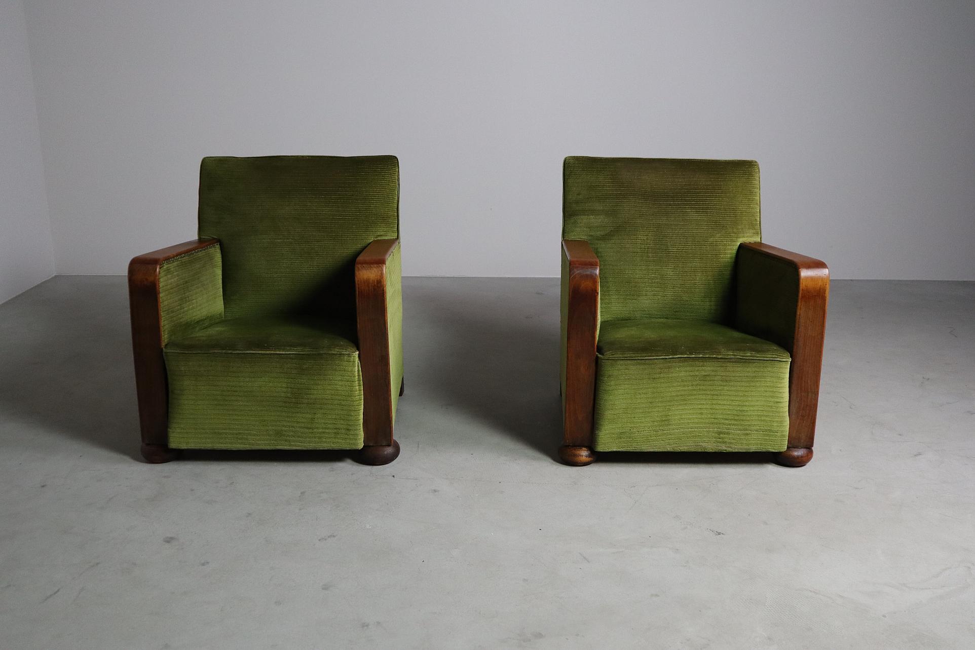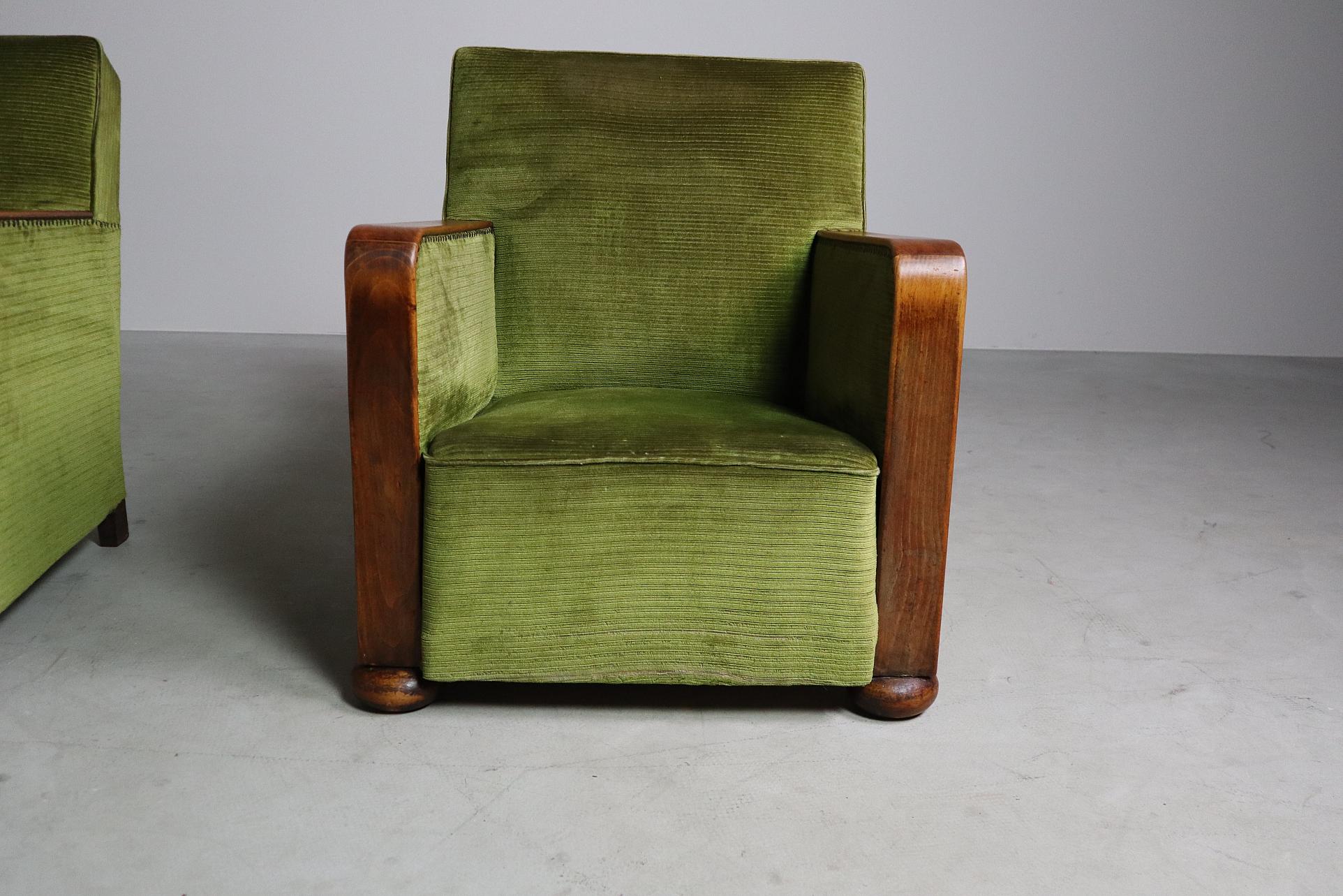 A refined pair of authentic Art Deco club chairs, circa 1930. The chairs feature solid wooden armrests with elegant curves, short rounded feet and decorative studs along the edges. Upholstered in their likely original green ribbed velvet, they have developed a charming patina and light wear consistent with age.