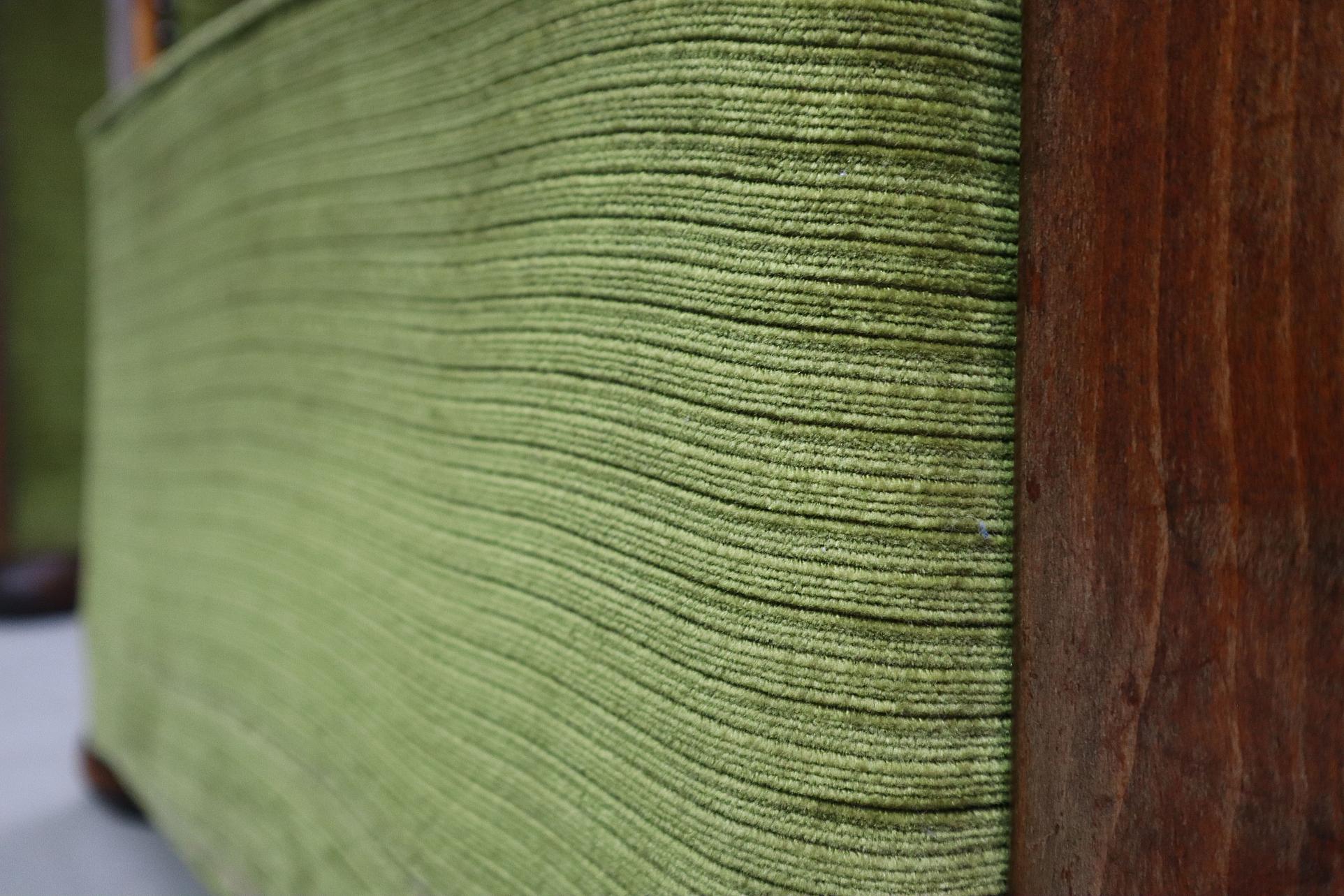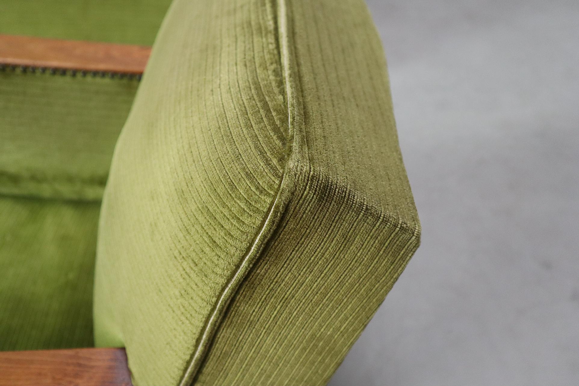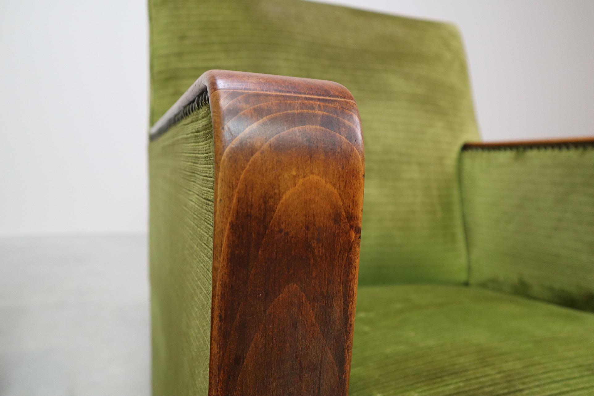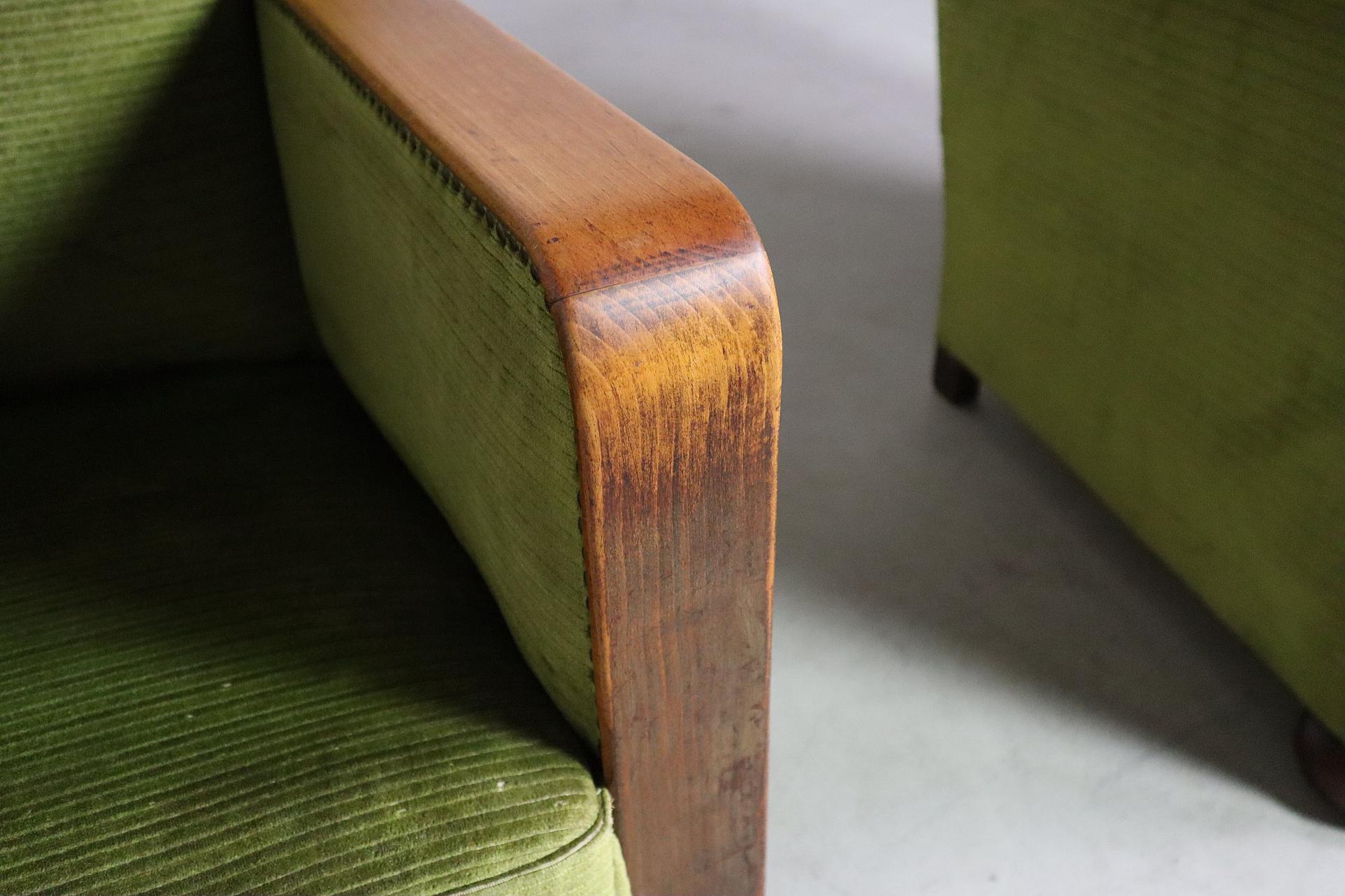 A refined pair of authentic Art Deco club chairs, circa 1930. The chairs feature solid wooden armrests with elegant curves, short rounded feet and decorative studs along the edges. Upholstered in their likely original green ribbed velvet, they have developed a charming patina and light wear consistent with age.
