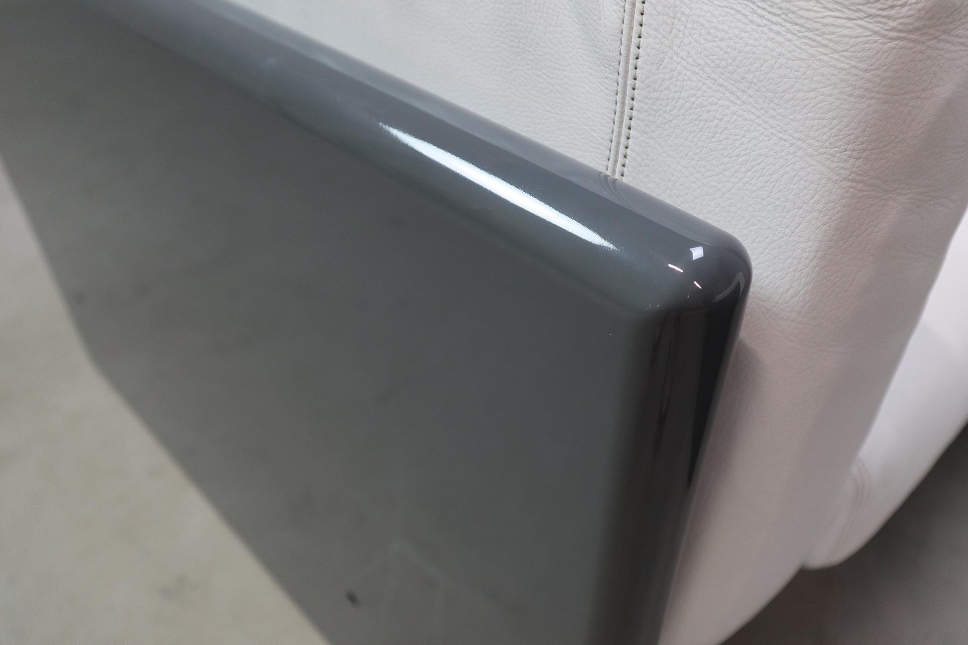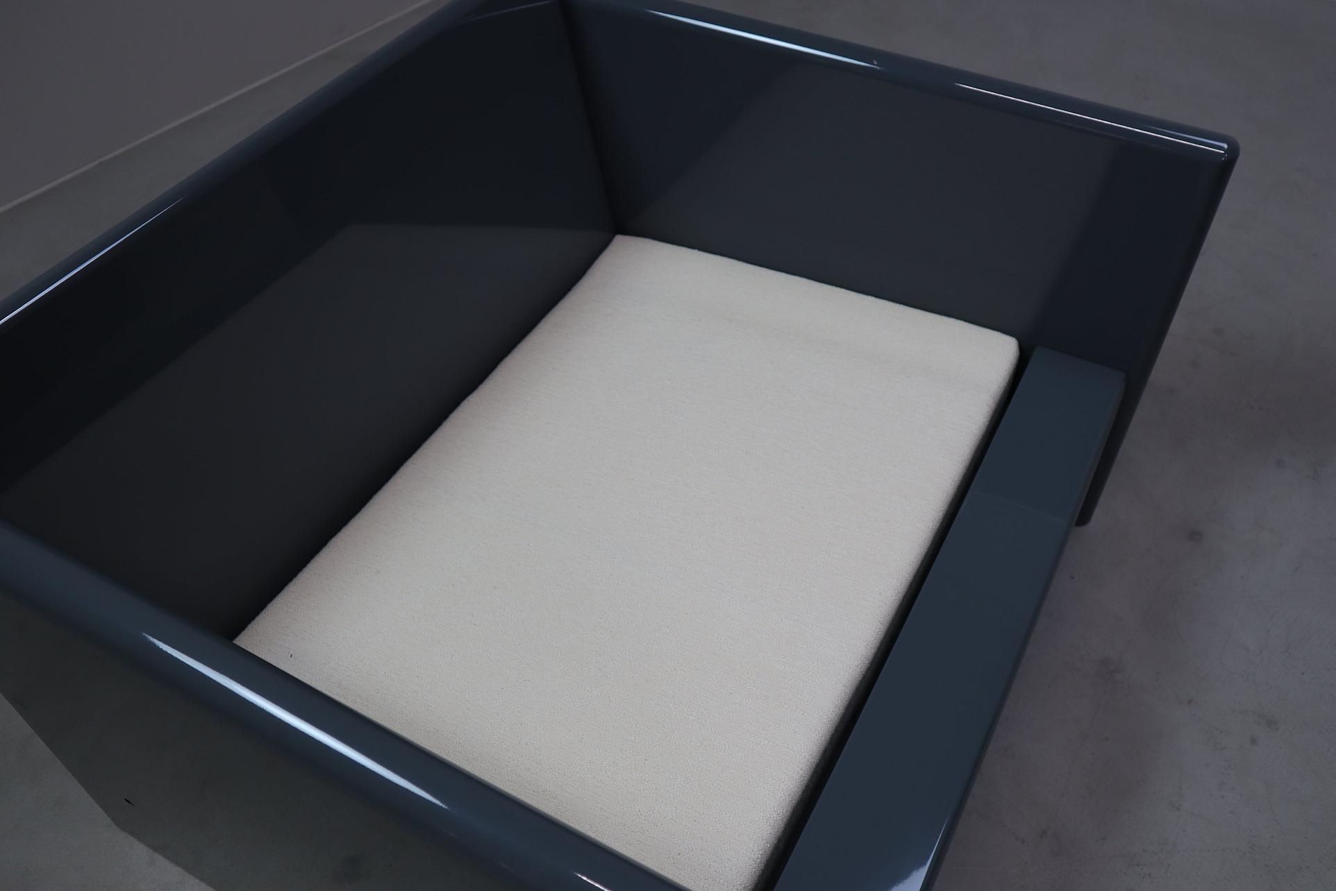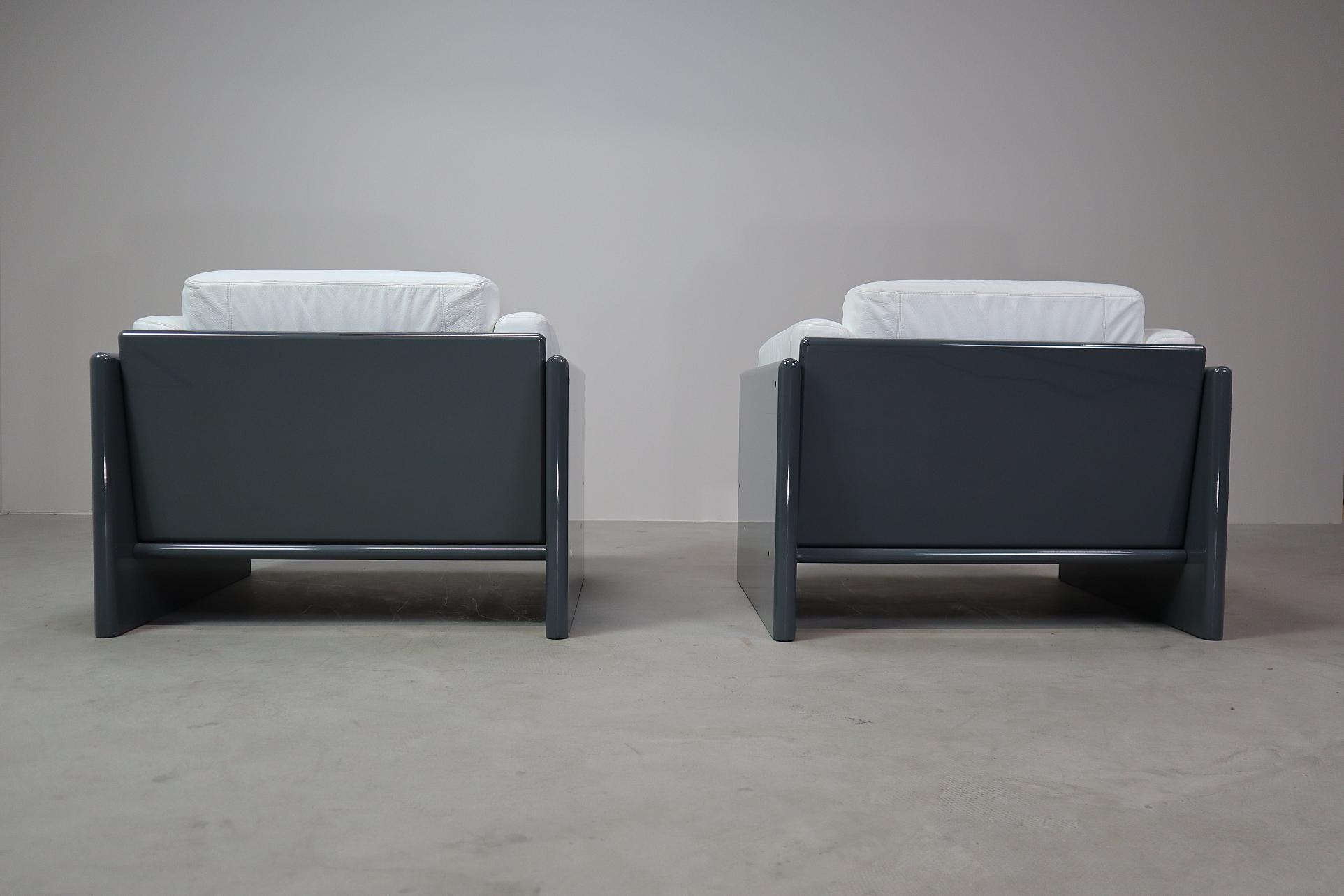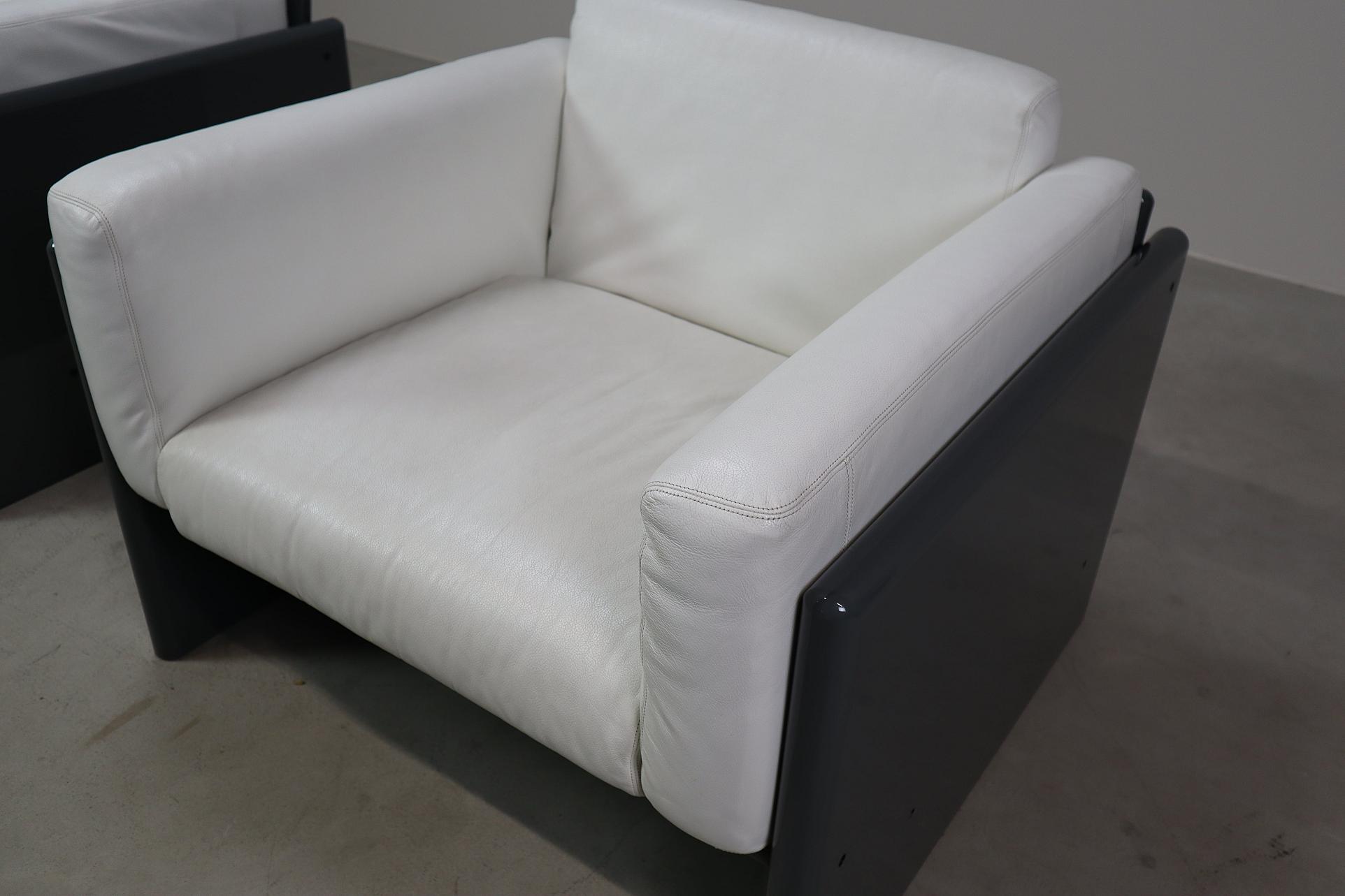 A rare set of two “Arnolfo” armchairs, designed by Mauro Marzocchi for Simon International in Italy, 1971. These lounge chairs feature a striking high-gloss lacquered wooden frame in deep grey, paired with the original white leather cushions. The bold cubic design with clean lines and generous seating space is characteristic of Italian postmodern aesthetics.