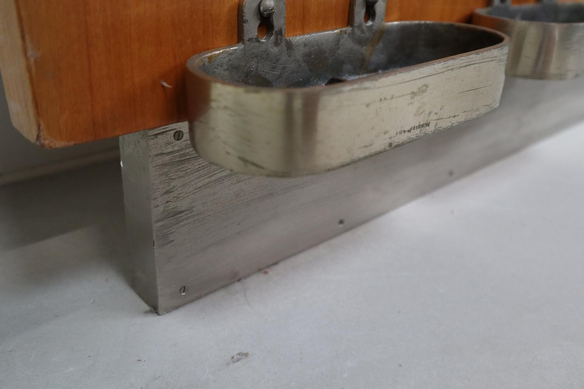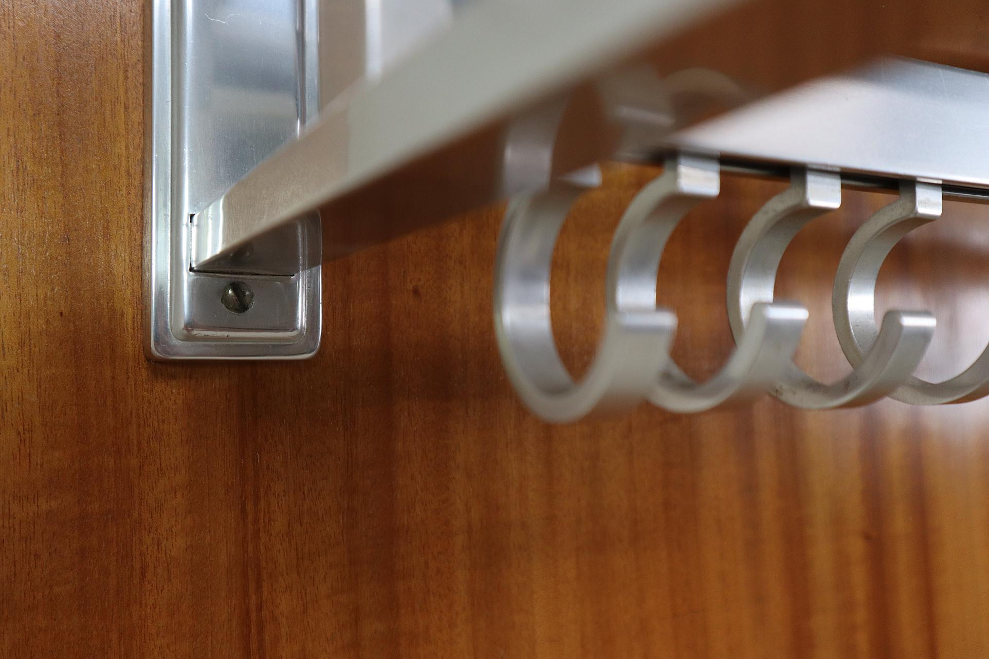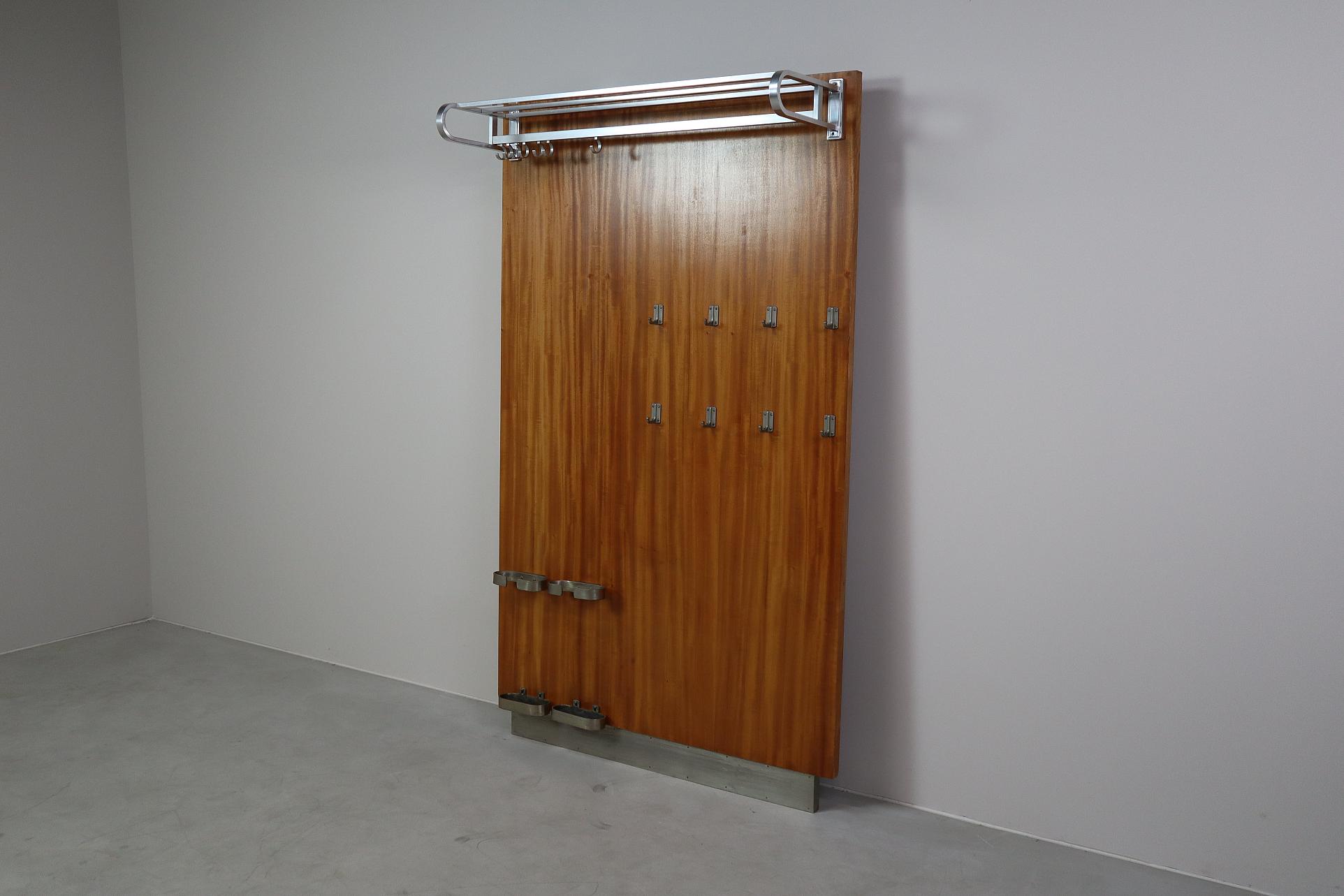 The top features a streamlined Aluminium hat and luggage rack with rounded ends, complete with hanging hooks underneath. The central section holds a grid of original single metal coat hooks, likely in Aluminium allowing for jackets, coats and accessories.