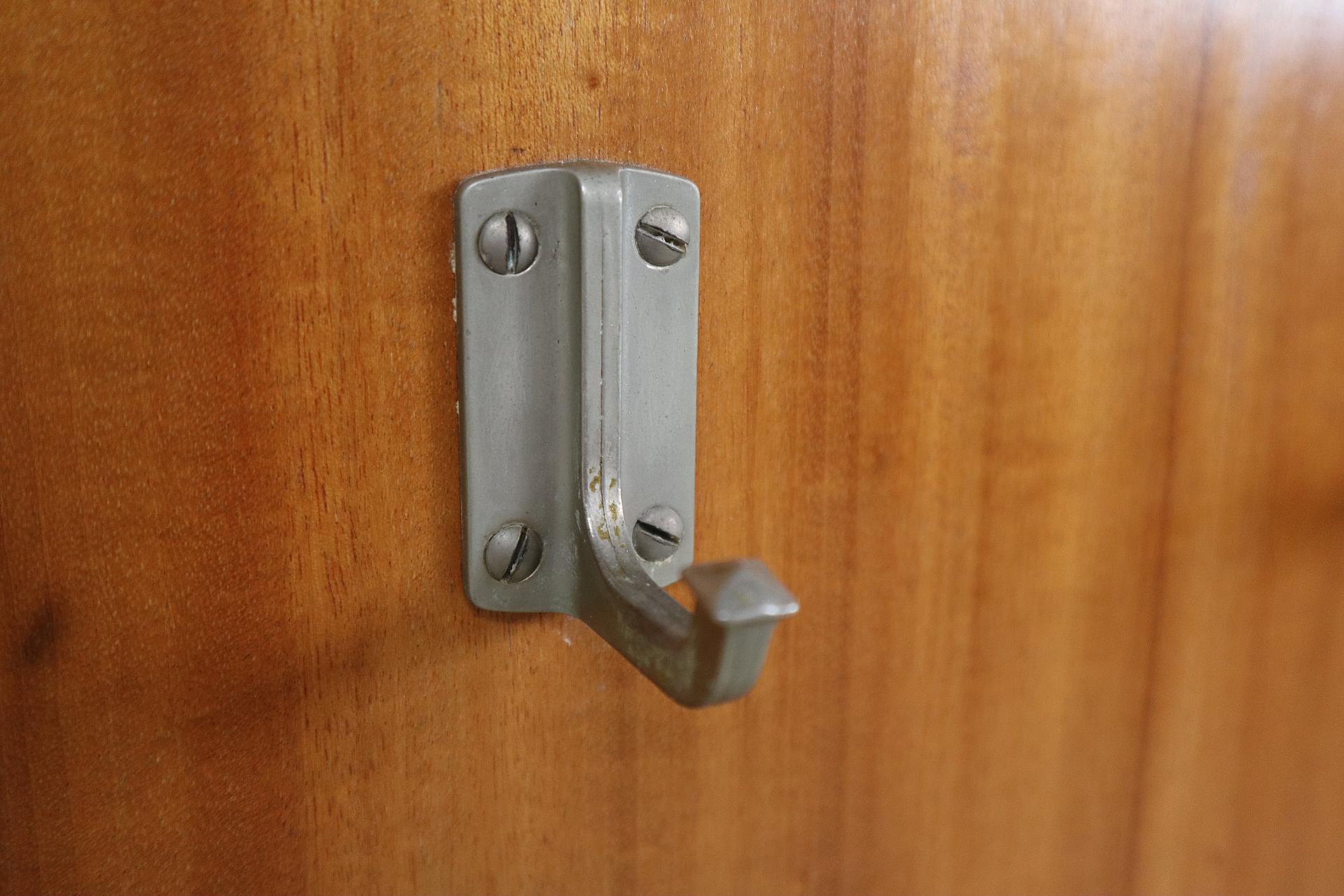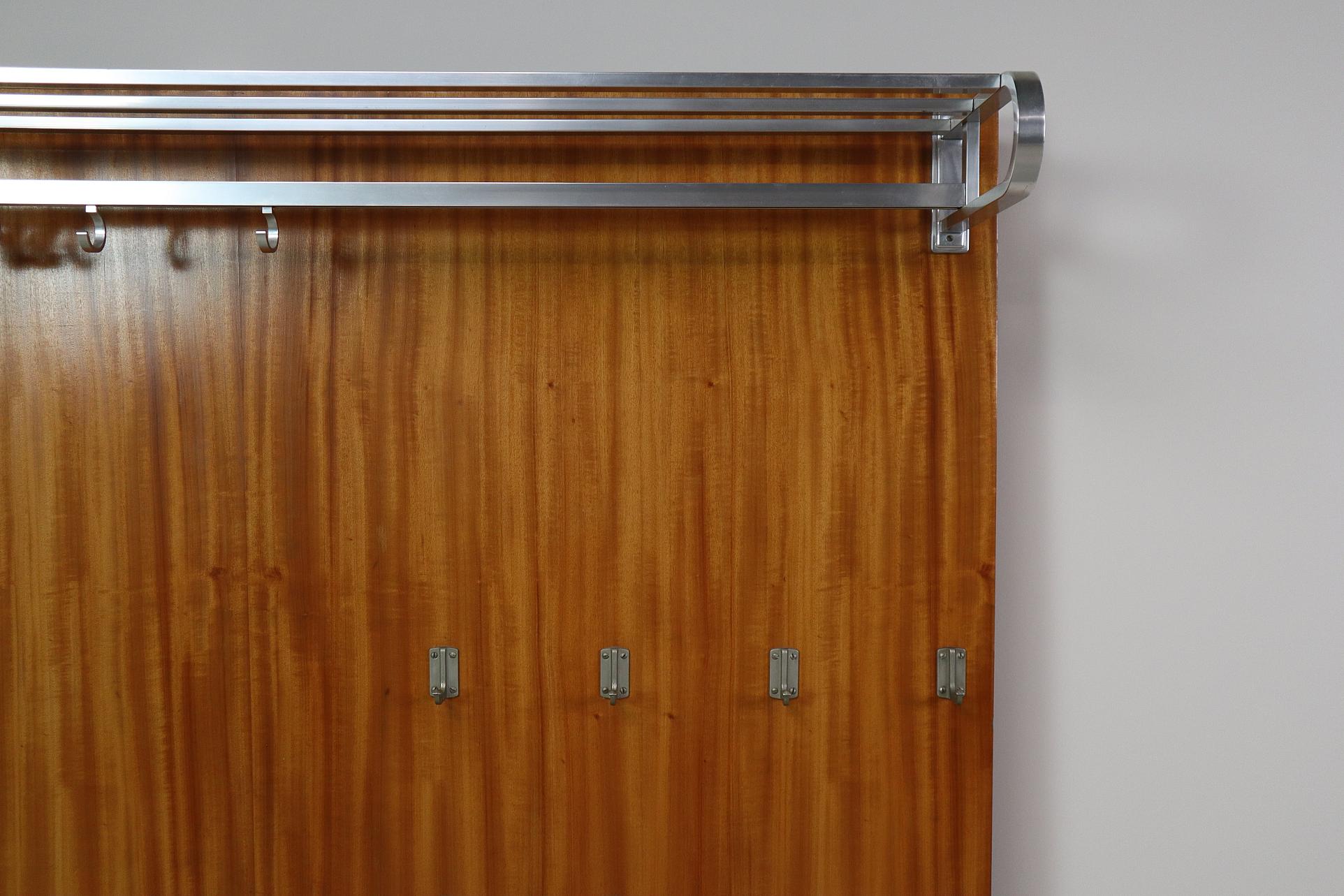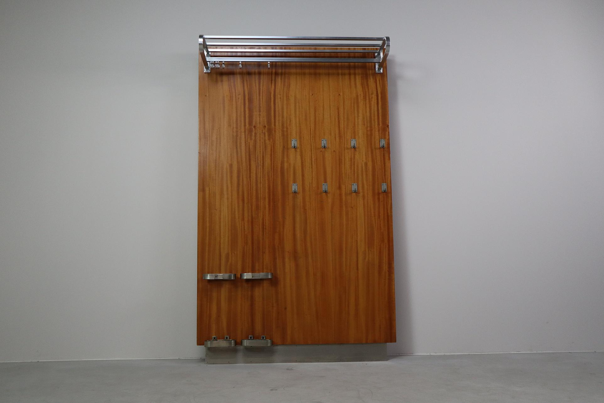 A striking mid-century modernist wall-mounted cloakroom panel in warm Teak veneer, fitted with elegant metal details.