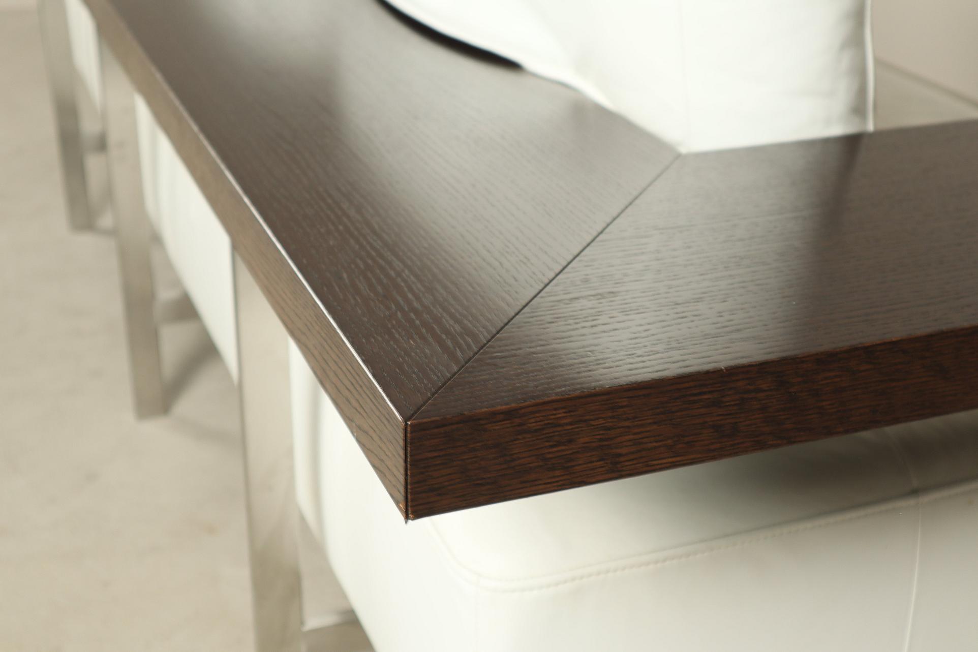 The piece is defined by its striking architectural frame with wide veneered wooden shelves that extend along the back and sides, resting on brushed stainless steel supports. The loose back cushions are positioned against the shelf, creating a light and open silhouette while offering flexible arrangement.