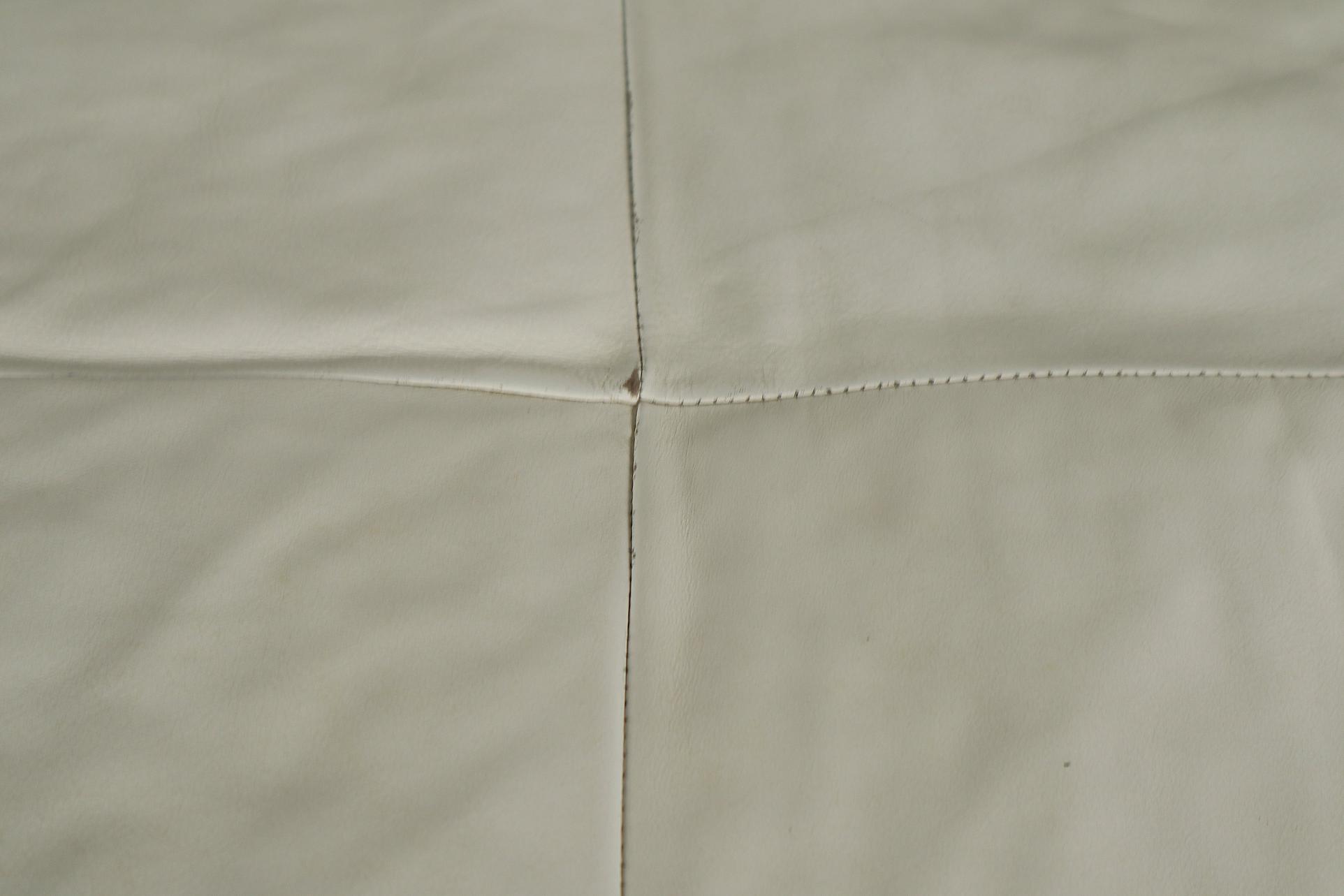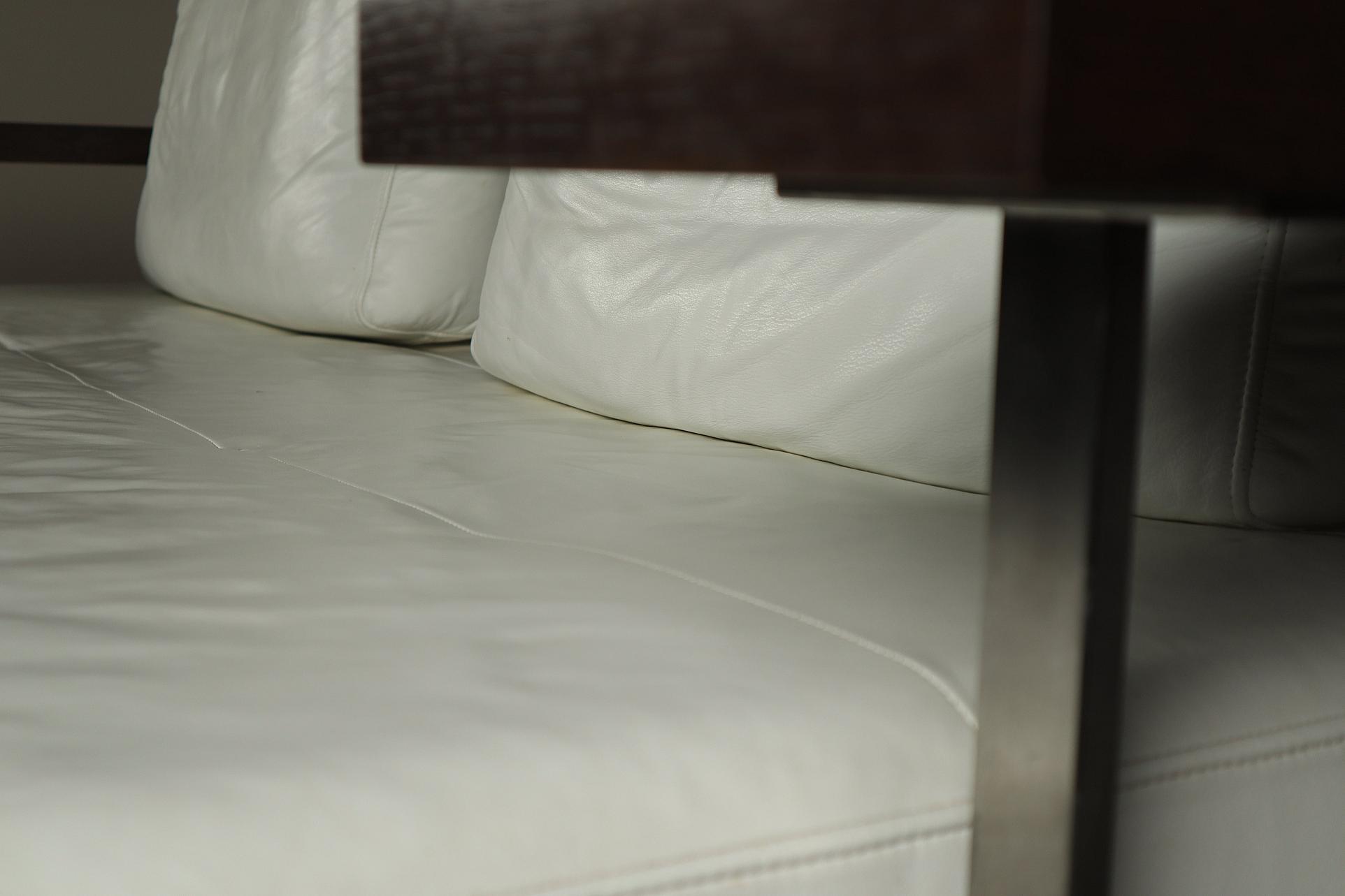 Upholstered in supple white leather, the sofa carries the subtle patina of time with some natural wear that enhances its authentic character.