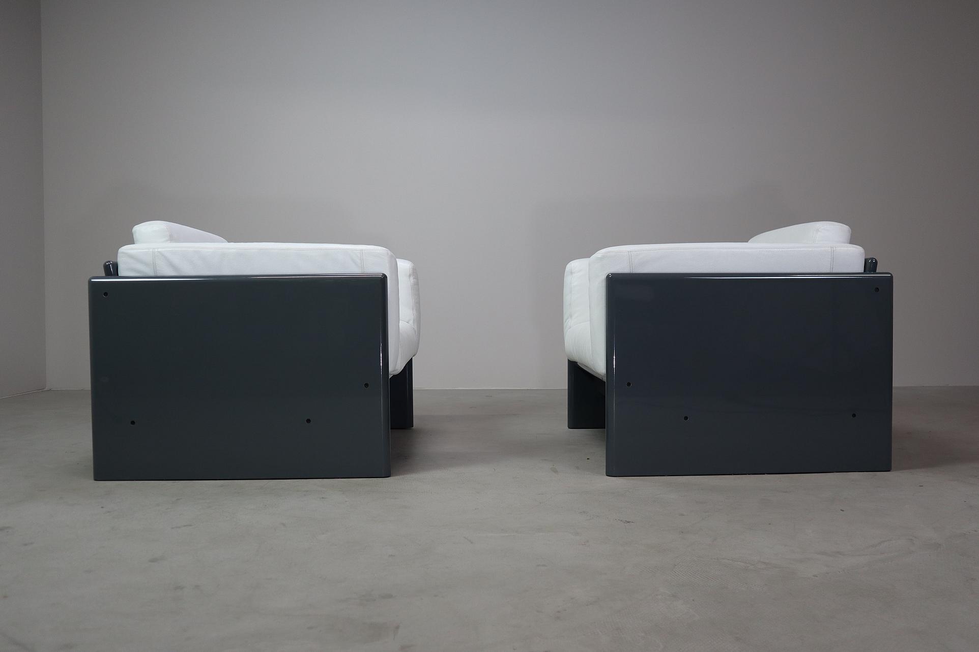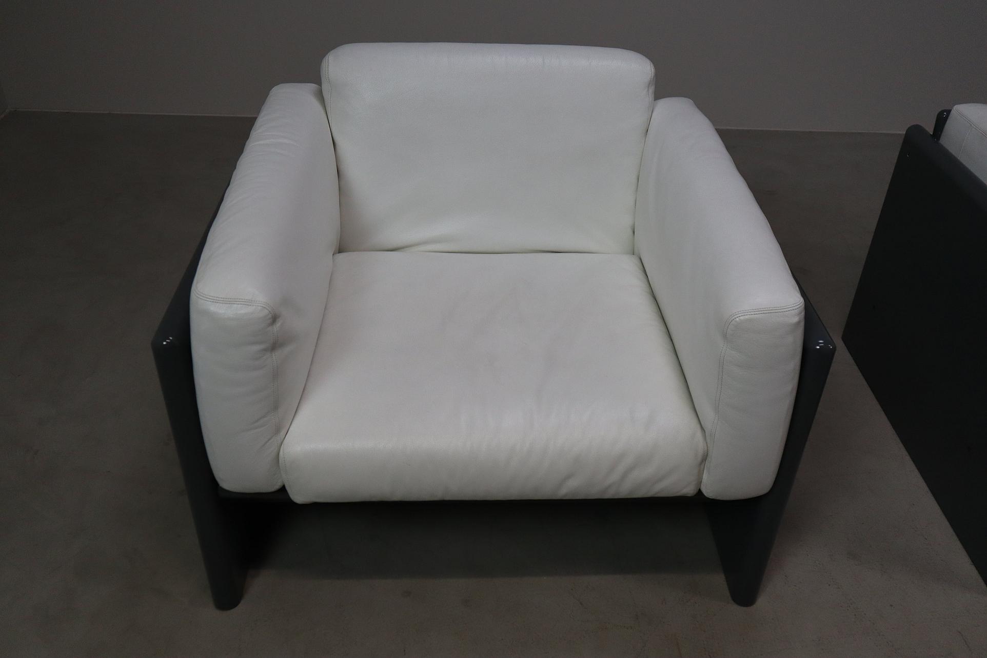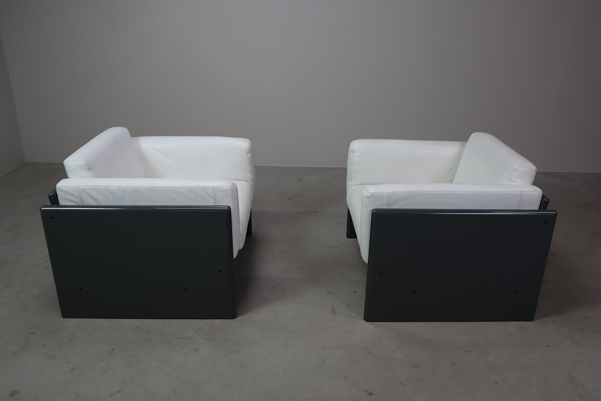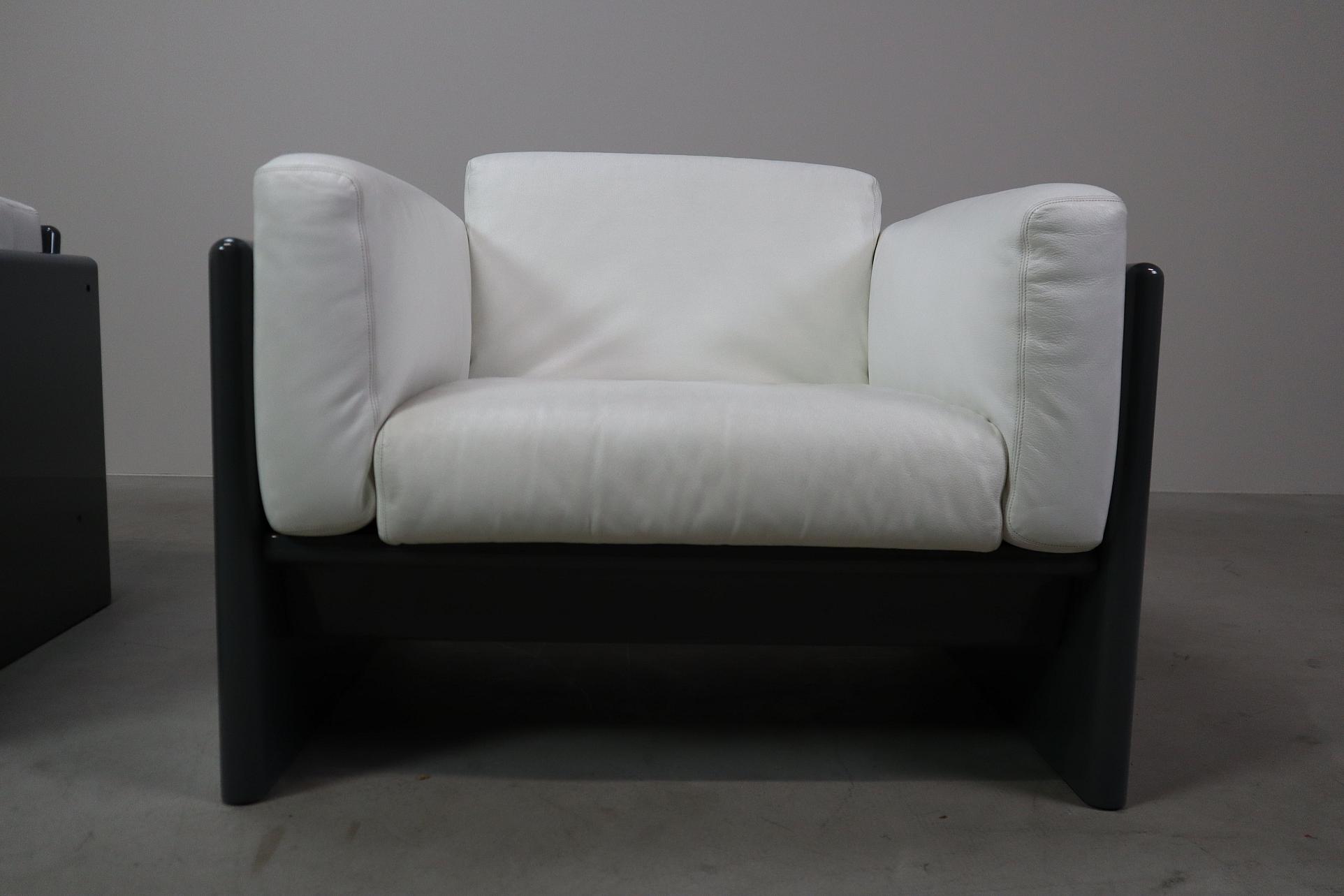A rare set of two “Arnolfo” armchairs, designed by Mauro Marzocchi for Simon International in Italy, 1971. These lounge chairs feature a striking high-gloss lacquered wooden frame in deep grey, paired with the original white leather cushions. The bold cubic design with clean lines and generous seating space is characteristic of Italian postmodern aesthetics.