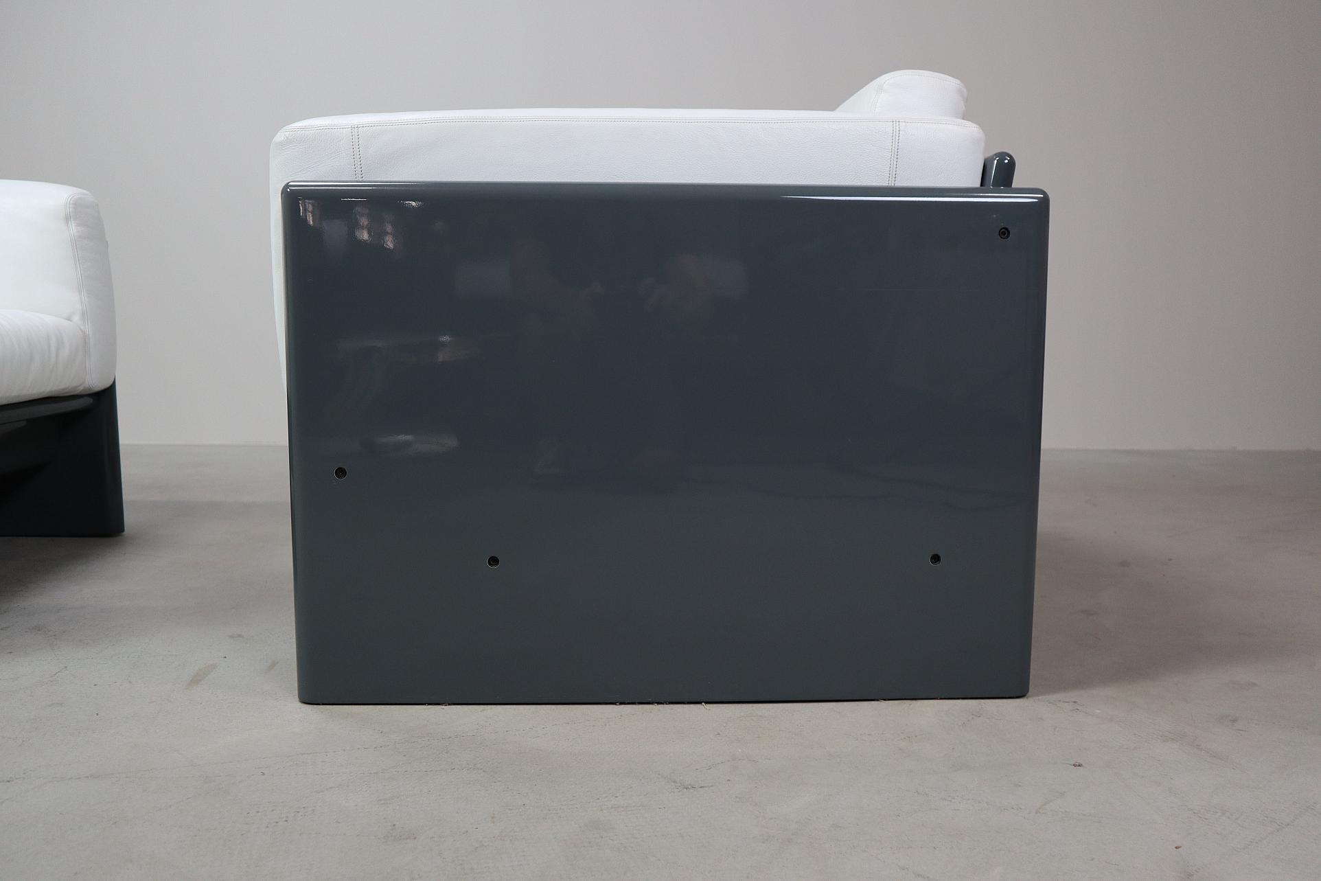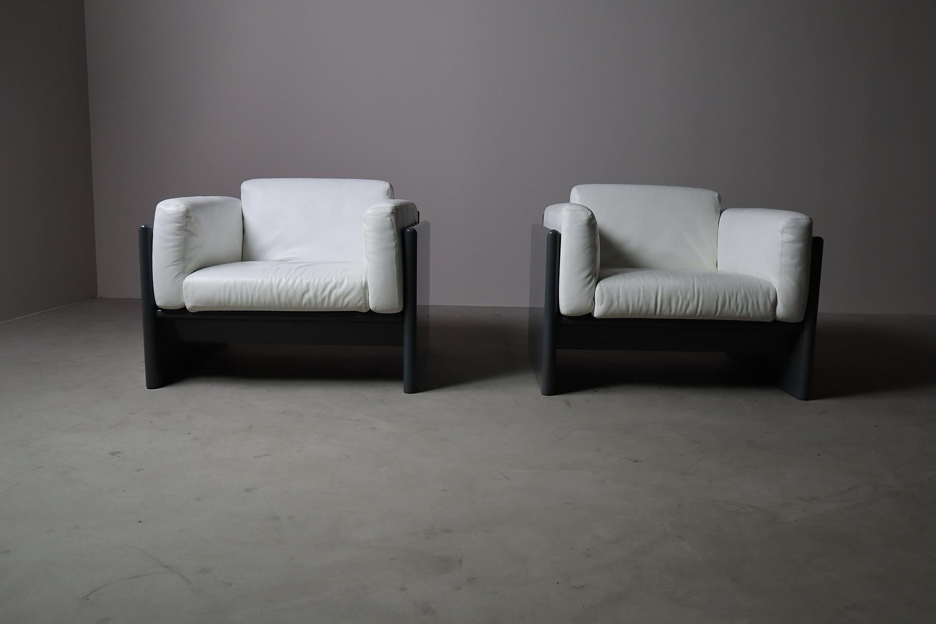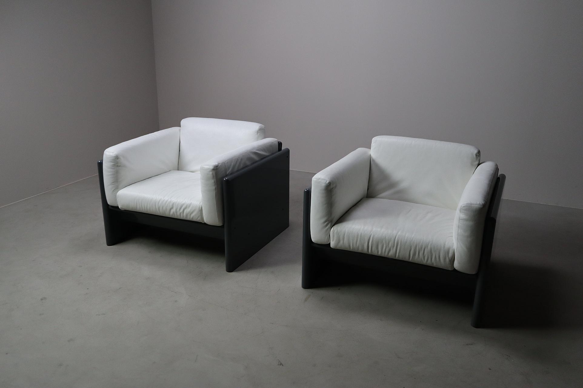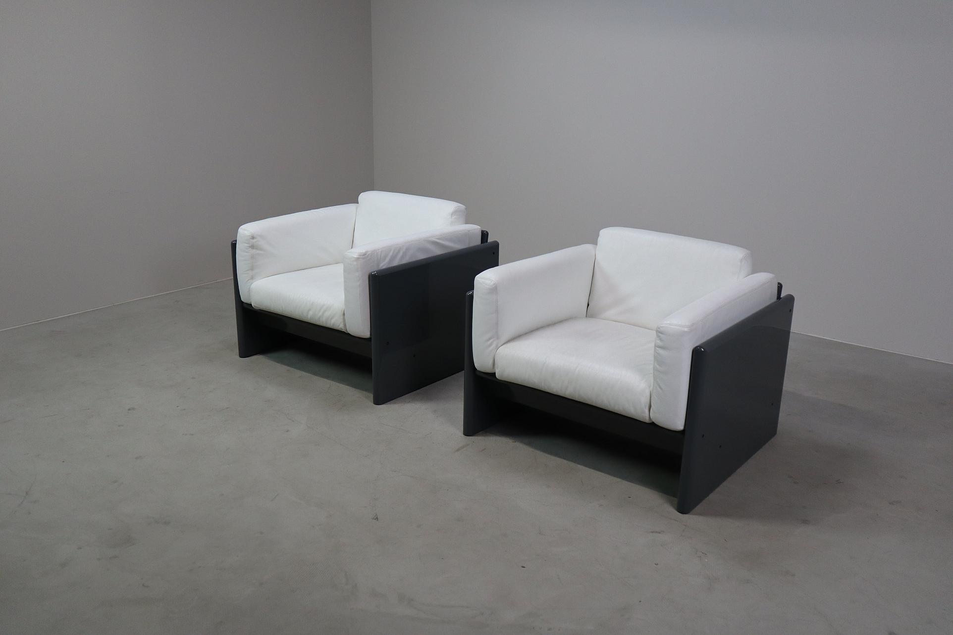 A rare set of two “Arnolfo” armchairs, designed by Mauro Marzocchi for Simon International in Italy, 1971. These lounge chairs feature a striking high-gloss lacquered wooden frame in deep grey, paired with the original white leather cushions. The bold cubic design with clean lines and generous seating space is characteristic of Italian postmodern aesthetics.