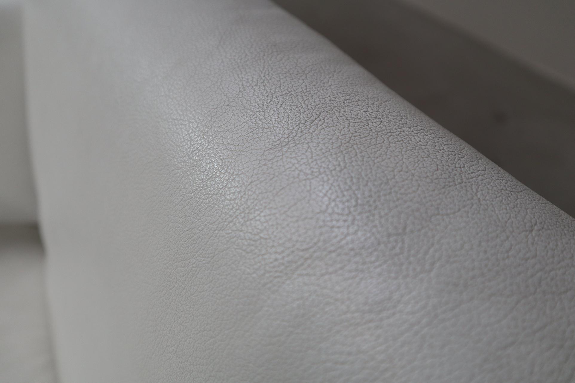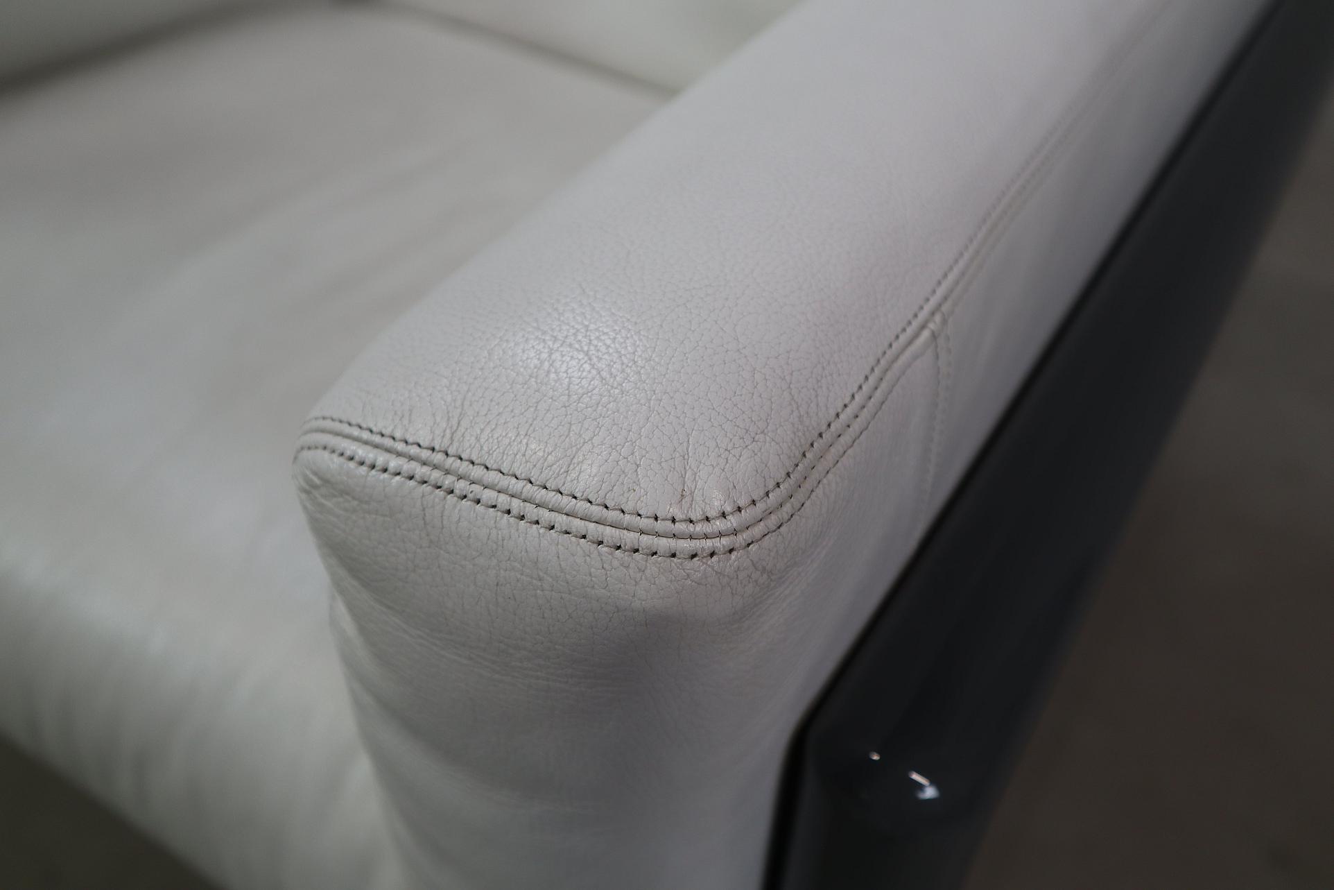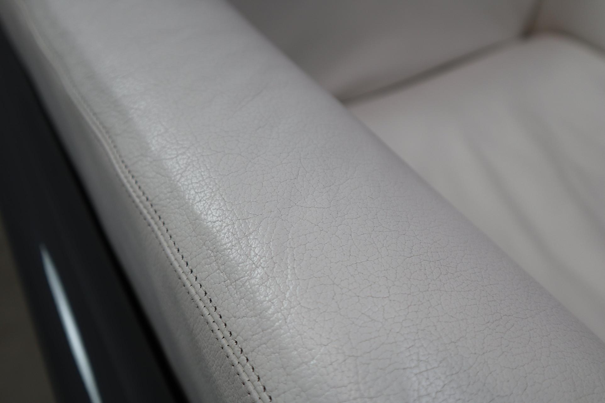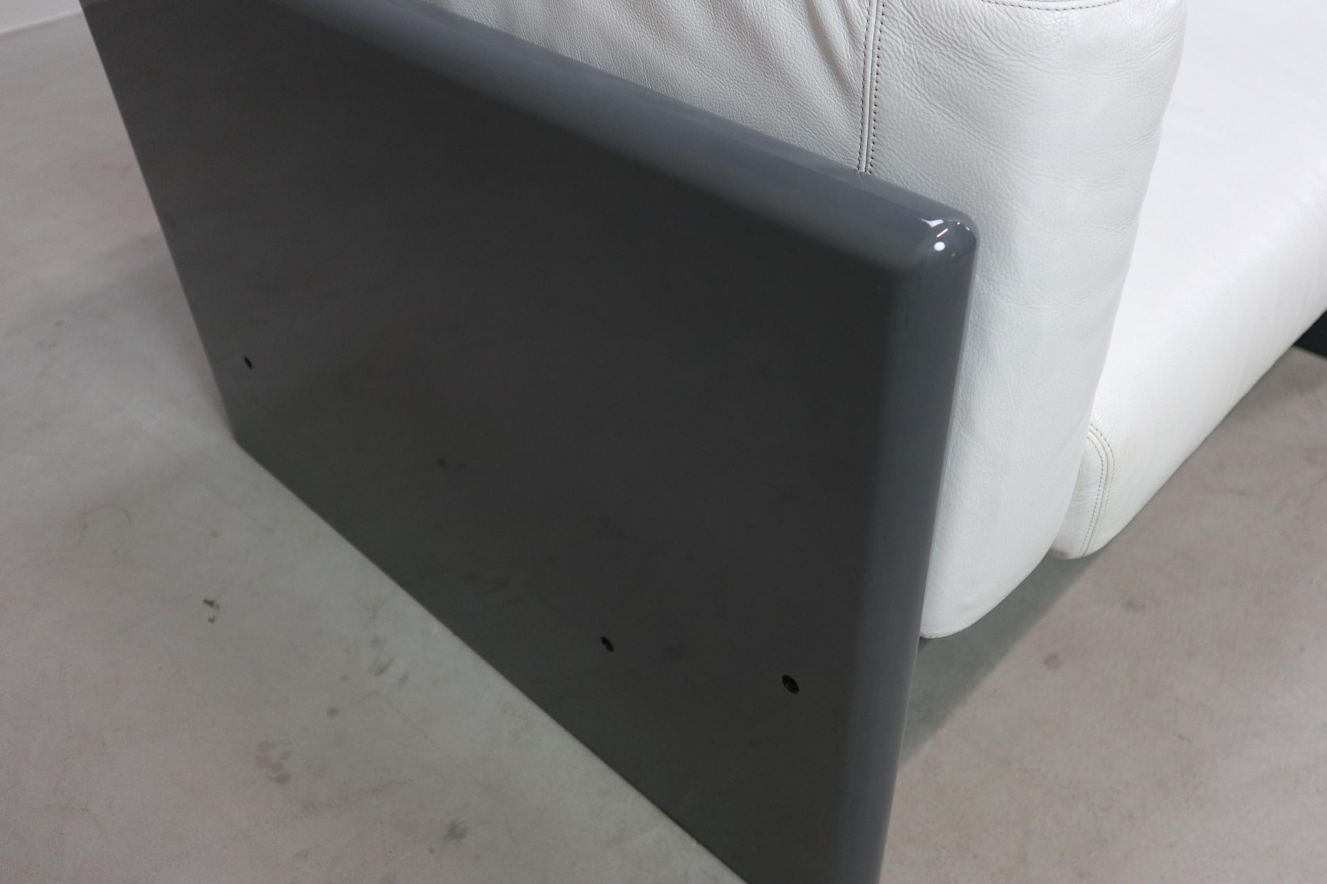 A rare set of two “Arnolfo” armchairs, designed by Mauro Marzocchi for Simon International in Italy, 1971. These lounge chairs feature a striking high-gloss lacquered wooden frame in deep grey, paired with the original white leather cushions. The bold cubic design with clean lines and generous seating space is characteristic of Italian postmodern aesthetics.
